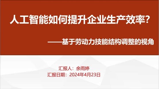 余雨婷同学分享了一篇相关文献——《人工智能如何提升企业生产效率?——基于劳动力技能结构调整视角》,文章从企业层面考察了人工智能技术如何影响生产效率和劳动力技能结构,运用机器学习方法生成了人工智能词典,进而构建了企业层面的人工智能指标。研究发现,人工智能显著提升了中国上市公司的生产率。在当前深化人工智能技术研发应用和壮大数字经济的背景下,文章提出的政策建议为企业调整劳动力技能结构、优化人工智能的生产率效应作出了有效指导。