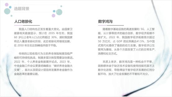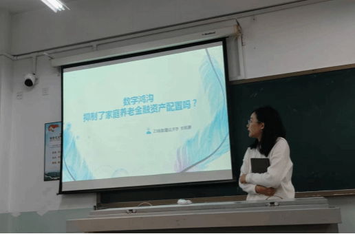 张毓慧同学分享了《老年数字鸿沟抑制了家庭养老金融资产配置吗?》一文,文章利用 CHFS 数据,利用熵值法构建了老年数字鸿沟指标体系,实证分析了老年数字鸿沟对家庭养老金融资产配置的影响。研究发现,老年数字鸿沟的存在会显著抑制家庭养老金融资产配置,并通过造成金融排斥、增加家庭风险厌恶程度来抑制家庭养老金融资产配置。作者提出多方协同助力跨越老年数字鸿沟、供需两侧发力推动养老金融普惠性提升等政策建议,对老年数字鸿沟治理、优化家庭养老金融资产配置结构、强化家庭养老经济功能具有重要的理论和实践价值。