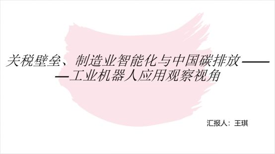 王琪同学以《关税壁垒、制造业智能化与中国碳排放———工业机器人应用观察视角》为主题进行分享。她从关税壁垒是否会对制造业碳排放产生影响、具体通过何种渠道、不同行业间是否存在明显差异以及造成这一差异的主要原因几个方面进行探究,考察了关税壁垒对制造业碳排放的影响和智能化转型的作用。研究表明,关税壁垒在减少资本密集型行业碳排放的同时增加了非资本密集型行业的碳排放,从行业层面拓展了环境问题的相关研究,为当前国内外形势下如何“先立后破”地促进我国制造业绿色转型提供了政策启示。
