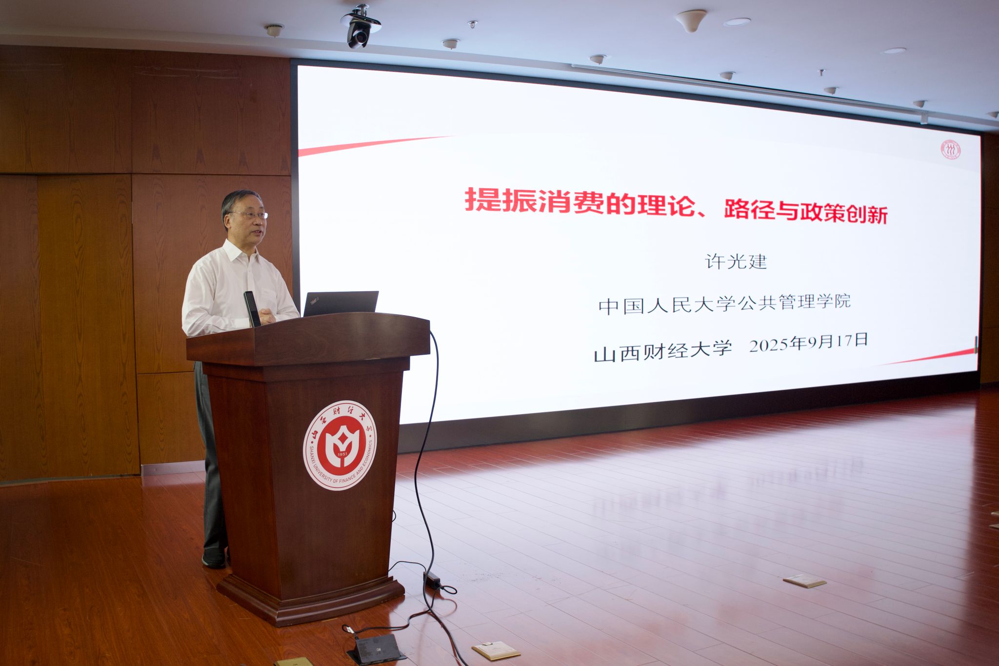 名家讲堂在图书馆东馆一层报告厅成功举行。中国人民大学公共管理学院公共政策系教授、博士生导师许光建受邀作了以“提振消费的理论、路径与政策创新”为主题的学术讲座。许光建教授兼任中国价格协会副会长、中国宏观经济学会常务理事、中国市场监管学会常务理事等职务,曾任人大公共管理学院常务副院长等职。长期从事宏观经济理论与政策、财政理论与政策、价格理论和价格政策等相关研究,是国务院政府特殊津贴获得者,也是我校1977级计划统计专业的校友。校党委常委、副校长米子川教授主持本次讲座,学院教师与部分研究生参加讲座。