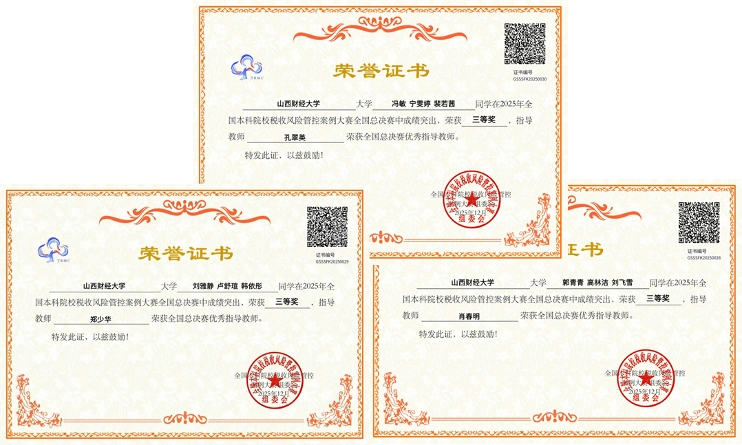 作为山西省分区赛的承办单位,自赛事启动以来,由学院财税学科竞赛委员会全面统筹赛区组织工作。分区赛共征集作品50余份,评审团队由业界业务骨干、注册税务师及高校专家共同组成。学院领导高度重视本届赛事,在广泛动员学生积极参与的同时,系统组建了由专业教师与实践基地专家构成的指导团队,为参赛学生提供全程化、专业化支持。从分区赛到全国总决赛,指导教师团队以精准、严谨的指导,带领学生反复打磨案例,不断提升作品质量。全国总决赛采用“案例汇报+专家提问+现场答辩”的综合考核方式,经过激烈角逐,3支代表队均荣获国家级三等奖,充分展现了我校学子扎实的专业功底、出色的团队协作与应变能力,也体现了学院长期以来重视教学实践、以赛育人的显著成效。