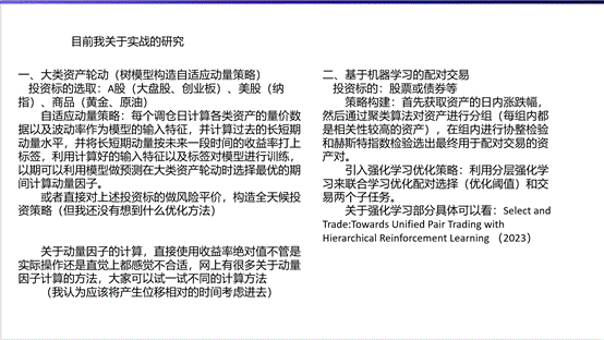 张晋玮同学以《基于CEEMD-CNN-LSTM的股票指数集成预测模型》为主题进行分享, 文章利用CEEMD对沪深300收盘点数进行了分解,得到了7IMF分量和1个残余分量,后续通过游程判定法对IMF进行了合并。张晋玮同学分享过程中最大的特点是加入了非常多的个人关于量化研究的观点思考,结合了自己的实习经历,分享了关于自适应动量策略、基于机器学习的配对交易以及机器选股方面的研究进程。苏老师对张晋玮同学分享中的巧思给予了充分肯定,并对其之后关于机器学习方面的研究提出了相关建议。